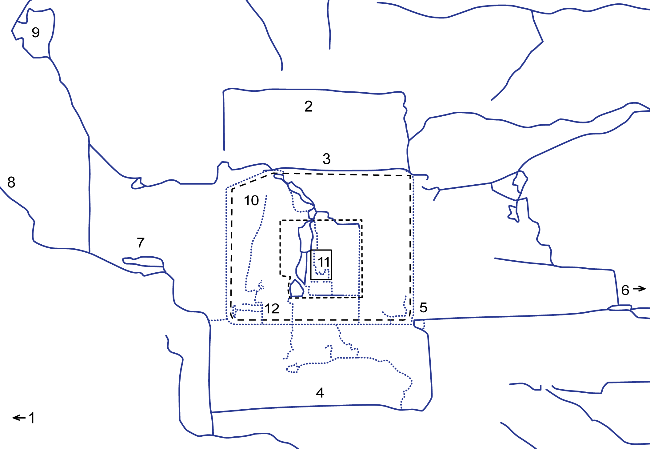 The Yuyuan Lake formerly served as an excursion retreat for the Imperial family and was connected by canal to the Inner City to the east. Today, a pleasure boat takes you from this lake to Kunming Lake and the Summer Palace to the north (9) via the Beijing-Miyun Diversion Canal. An alternative pleasure tour starts from Nanchang Canal behind the Beijing Zoo and passes through Purple Bamboo Park before joining the same Beijing-Miyun Diversion Canal. The latter route in reverse originally drew waters from Yuquan Hill to the west and Baifu Spring to the north of Kunming Lake down to Jishui Lake (10) at the northwest Inner City wall, for supplying water to the Inner City. The tiny West Lake just to the east of the Jishuitan subway stop on Line 2 is all that remains of the once large Jishui Lake. It’s the westernmost of a connected string of six lakes, Xihai, Houhai, Qianhai, Beihai, Zhonghai, and Nanhai. The latter three lakes were formerly enclosed by the Imperial City (inner dashed line) and fed into the Forbidden City.