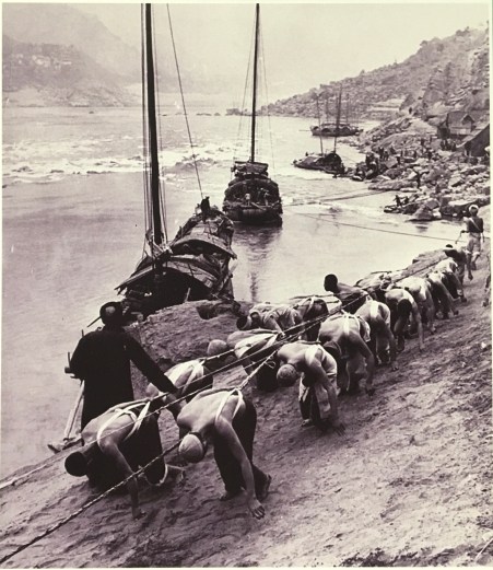 At times [the trackers] are a quarter of a mile ahead. Soft echoes of their coarse chanting came down the confines of the gully, after the rapid had been passed, and in rounding the rocky promontory mid-stream, one would catch sight of them bending their bodies in pulling steadily against the current of the river. Occasionally one of these poor fellows slips; there is a shriek, his body is dashed unmercifully against the jagged cliffs in its last journey to the river, which carries the mutilated corpse away. And yet these men, engaged in this terrible toil, with utmost danger to their lives, live almost exclusively on boiled rice and dirty cabbage, and receive the merest pittance in money at the journey’s end.