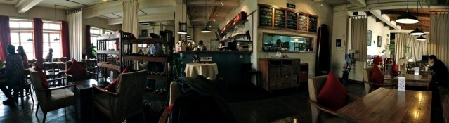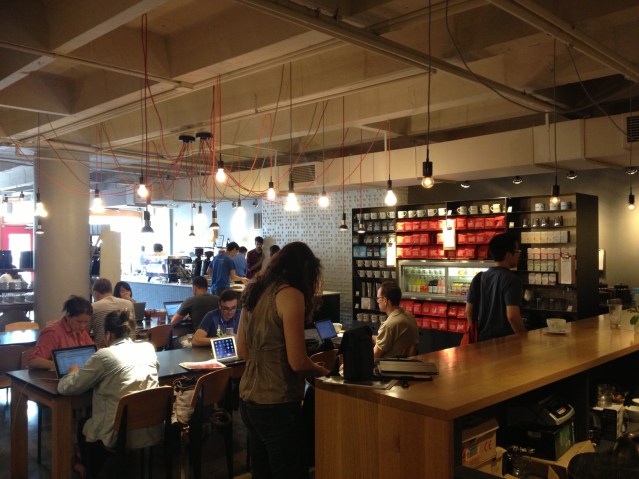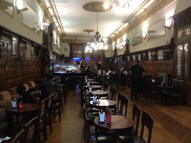 A coffeehouse’s greatest asset is its size. Most of us coffee habitués are drawn to big busy establishments where we can people-watch — and be watched. I’ve always wondered what it is about space that feels so luxurious. Is it the suggestion of wealth, of living or lounging for a few hours in a grand interior as if it were one’s own? Restaurants and bars don’t seem to rely as much on the same appeal (though it can hardly hurt); in them you’re more caught up in a process — the potent fragrances of the food and drink, the company and the conversation at hand, the contracting funnel of inebriation — than in a place. You’re in, and you’re out. In a café, on the other hand, there is no hurry to get up and leave, whether due to pressure to vacate your table, or because you’ve had enough to drink, or you’ve succeeded in scoring your one-night stand. You are able, indeed encouraged, to stay as long as you want. In the café, time settles and slows down. You’re left to your own devices and resources. You’re invited to take in the surroundings, merge with them as it were. And the surroundings, therefore, are all the more important.