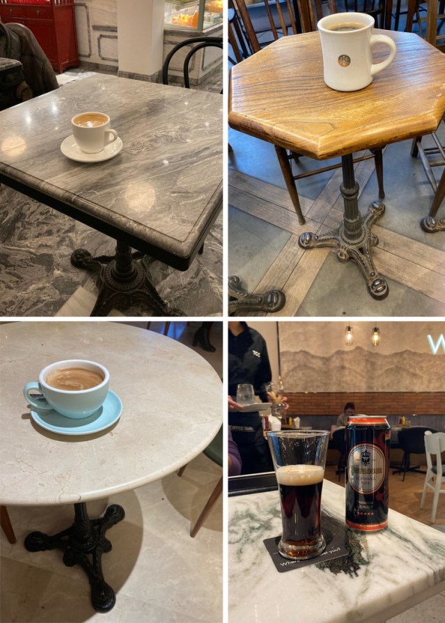 I suppose for most customers, a table is a purely functional thing standing on four legs and it’s enough it doesn’t collapse. But ask yourself if you are able to visualize the tables of your favorite coffeehouses in your mind’s eye. If so, you may even appreciate the café table as a thing of beauty. Whether of the polished marble or rugged wooden sort, it’s functional all right, being designed not only to be strong and stable but to appear so. A table that wobbles and causes the coffee to spill, or worse, onto one’s book, is not only traumatic, the anticipation of such is traumatic. There is a logic to the design of the classic Parisian marble-top bistro table with its cast-iron base: it’s heavy and indestructible and visually guarantees your coffee will be earthquake proof. Most bistro tables have a tripod base. You can also find them with four feet, which might seem to convey greater solidity but are in fact prone to rocking if the floor isn’t perfectly flat, whereas three feet are immune to rocking.