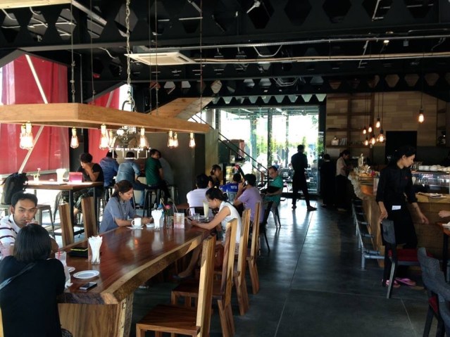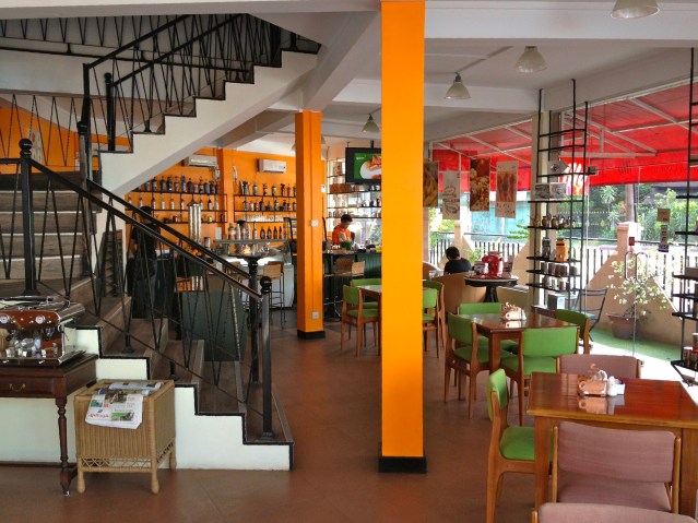 Shine is the effect achieved by neatness and cleanliness. It refers both to a “clean” style of décor — the ensemble of colors and textures right down to the surfaces of the floor and tables — and to the actual state of cleanliness. The surfaces need not literally shine. The hard sheen of floor tiling combined with the glare of a window-heavy environment can reinforce a cold, unwelcome ambience. This can make a coffeehouse interior feel colder than it actually is in wintertime and “cold” in summertime as well, if blinding sunlight is allowed to penetrate without adequate shading. The branch of Bangkok’s Coffee Club chain shown above has a pristine modernist design with just enough wood tones to preserve a sense of warmth and customer empathy. The Burmese café below acquires the same with its bright orange accents.