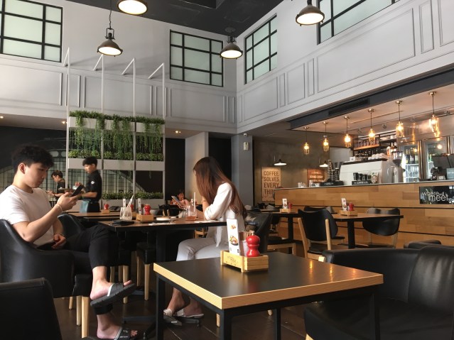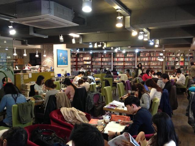 Especially when one needs an adequately illuminated space. If the facing windows don’t permit enough daylight, interior lighting must compensate. The rule of thumb is that the light should be sufficient to read a book without eye strain at most of an establishment’s tables. This brings us to the second purpose, the functional: adequate lighting for reading and work, for people who still enjoy the physical book but whose imperfect eyesight requires proper lighting. A poorly lit café sends the message that books aren’t welcome. Decent, directed lighting, or even simple reading lamps set on the table as in old-school libraries, shows respect for the traditional café habitués — the reader, the thinker, and the writer. One coffeehouse near a university in Seoul, as you can see, respected the book so much it defined its clientele as the studious university student and forbade talking.