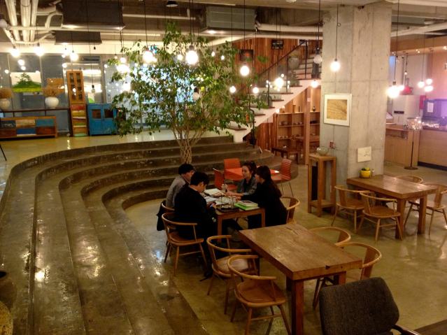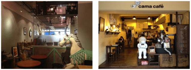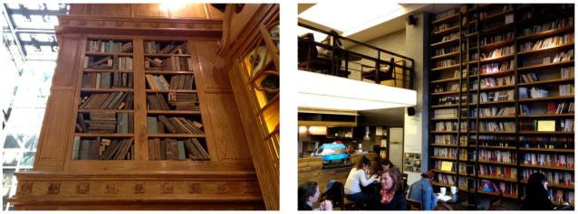 The complete coffeehouse, finally, needs to proclaim its links to tradition. One way to do this is to take over a storied space that held a former café or restaurant and preserve or maintain it. Carved wainscoting, stamped ceiling, elegant flooring, furniture, etc., may already be in place. But given that this is a rare fortuity, a compromise is to recreate the classic café ambience with a few suggestive design features. One Shanghai café, Funk & Kale, calls up the city’s earlier era of a century ago with its art-deco rounded corners. A few bookshelves with real books, literature for paging through, lending or purchase so that they aren’t mere décor (a ladder can establish this as in the Seoul coffeehouse below), or an artful symbolic bookcase, can effectively remind guests of the coffeehouse’s cultural heritage, refuge of bohemians and misfits and eccentric idea-generators, some of whom may become notorious enough to be immortalized and discovered by your grandchildren.