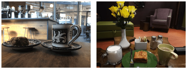 The dilemma of food for the coffeehouse is the smells: enticing for the hungry but unpleasant for the sated. This is the key distinction, if there is one, between the coffeehouse and the café. The latter has traditionally offered a wider food selection, or at least sandwiches. Coffeehouses on a shoestring may even offer no food (I’ve seen such places) but this is not recommended. Not to have at least something to resort to is really quite inconsiderate of the guest. Standard American coffeehouse fare has remained fairly consistent over the decades (later additions being of the gluten-free or vegan variety): some combination of cookies (chocolate chip, peanut butter, oatmeal raisin, lemon glaze, biscotti, chocolate-covered graham crackers), muffins, scones (with jam, butter or a dollop of whipped cream), toasted bagels (plain, whole wheat, onion, poppy seed, cinnamon raisin) and cream cheese, croissants. Richer fare (cakes, pies, sandwiches) are fine as long as a few items are available for less than the price of a coffee. This is not just due to the many regular coffeehouse-goers who are on a budget (indebted students, starving artists), but we often want nothing more than a little mid-afternoon snack. Included as well should be savory, not just sweet edibles, mindful of those who don’t like or can’t tolerate sugar.
