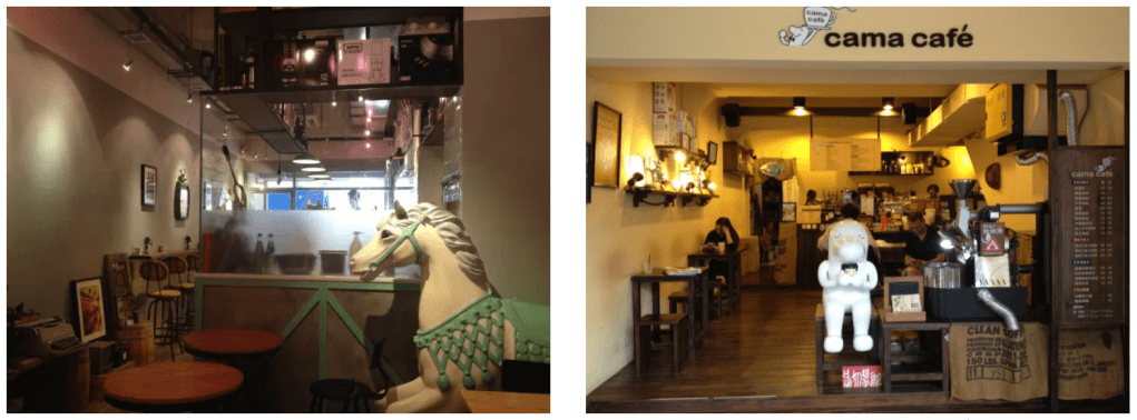 As space is at a premium, however, size is not always an option. Small cafés need to consider what they can do to compensate for their modest assets. A high ceiling can create just enough of an illusion of space to do the trick, like the two tiny cafés shown below in Hong Kong and Taipei. Note their clever use of the existing interior to extend the décor right up into the exposed ceilings: