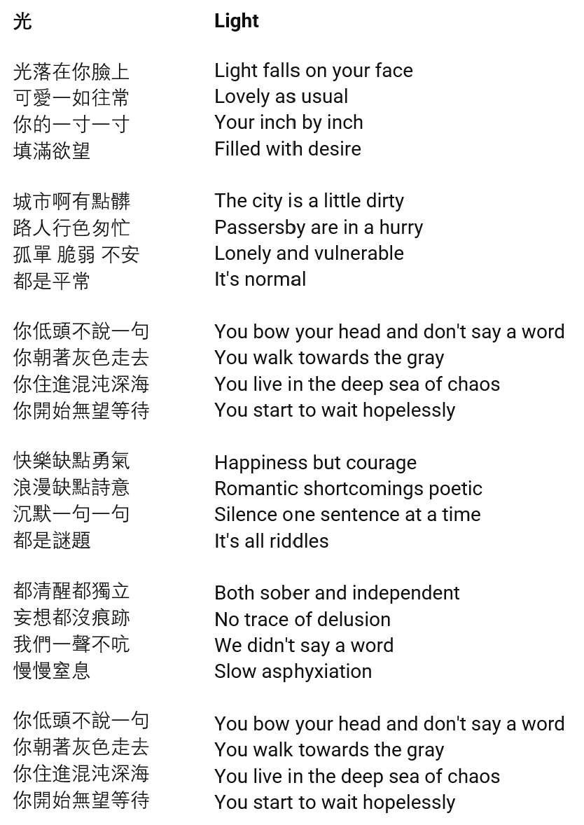 Chen Li composes all her own songs and the words to most of them. Lyricists on the Mainland are severely constrained and must find clever ways to fit the pathos of their music to text sanitized of any trace of the morally or politically objectionable — the same predicament of Chinese poets going back centuries who could fall afoul of local authorities with a few misplaced words. They found refuge in the language of nature and metaphor. At first glance, Chen’s lyrics might seem as bland as those of any other Chinese lyricist operating at present, but a closer look at a song such as the beautiful “Guang” (“Light”) reveals a subtle command of imagery that shifts from the romantic to the discordant while remaining ambiguous enough to be safely insulated from the censors. At the same time, the lyrics serve as a Rorschach blot to read one’s own state of mind into. The song’s cheerful melody belies the dark tones of its imagery to generate ironic tension. One Chinese friend I showed the lyrics to said they perfectly fit her own dour mood, stemming from China’s recent draconian zero-Covid lockdown of Beijing: