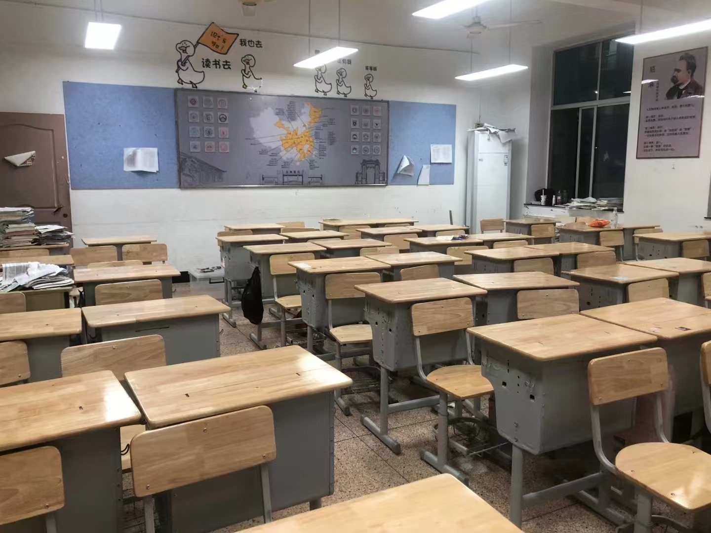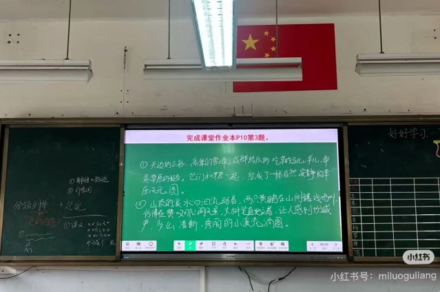 Apart from advances in technology, little has changed over the three decades since I visited that Chinese classroom. Computerized touch-sensitive LED screens have now pushed aside the old blackboard or are used in conjunction with blackboards or whiteboards. Eye-friendly ceiling lighting that filters out blue light has replaced fluorescent lighting. Classrooms are more spacious and increasingly shifting from six-across/eight-deep to eight-across/six-deep seating arrangements, bringing the students at rear closer to the teacher and the screen. The photo below (grabbed from the web) shows a typical LED screen, with the teacher’s notes on good prose style. The photo below that was taken by a university student of mine of her former high-school classroom, from which she graduated in 2024. Notice at far right the poster their teacher chose to put up on the wall, featuring a quote from Friedrich Nietzsche’s Thus Spoke Zarathustra on the “three metamorphoses of the spirit,” symbolized by the camel (self-discipline), the lion (independence and the challenging of authority), and the child (spiritual liberation and creativity).