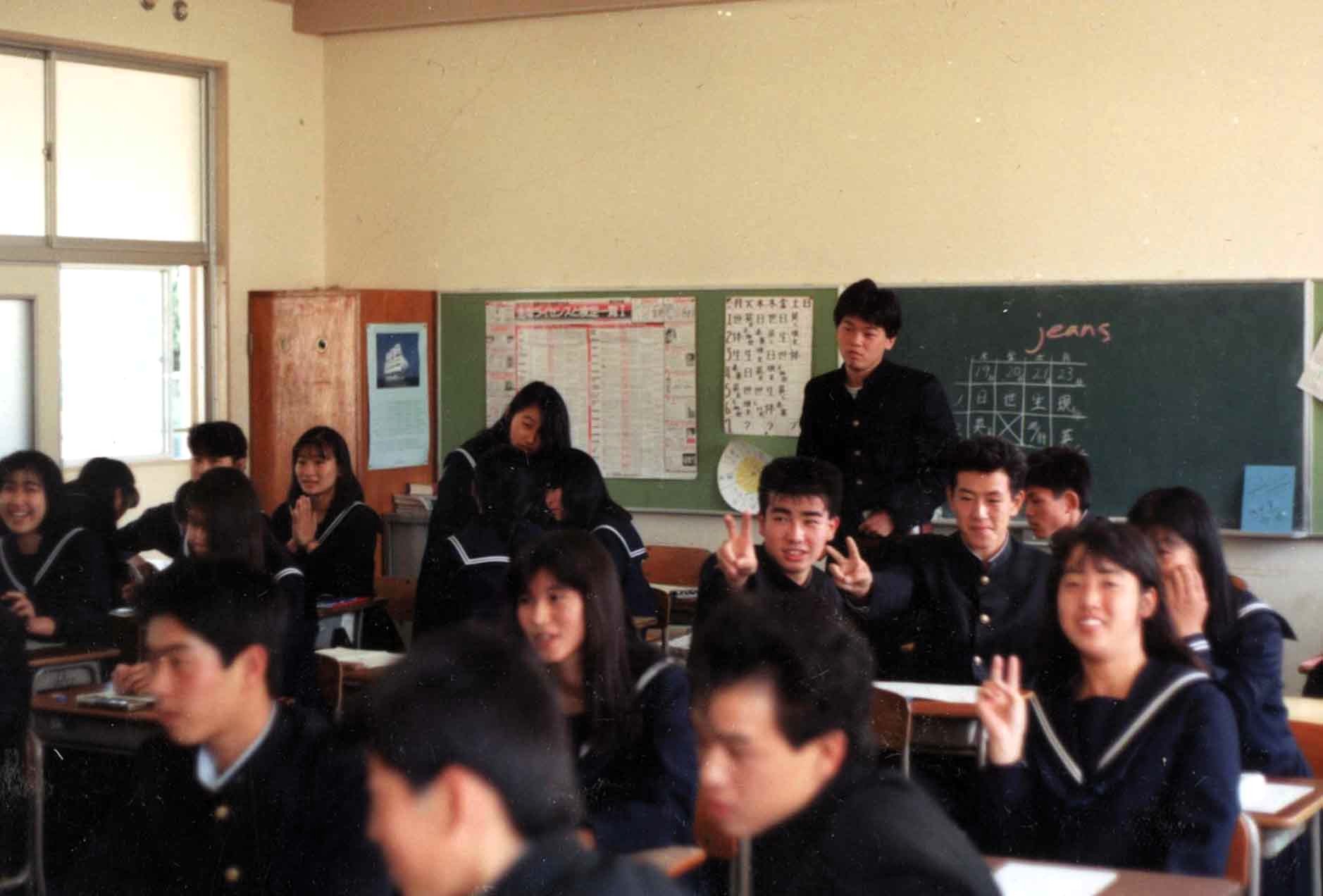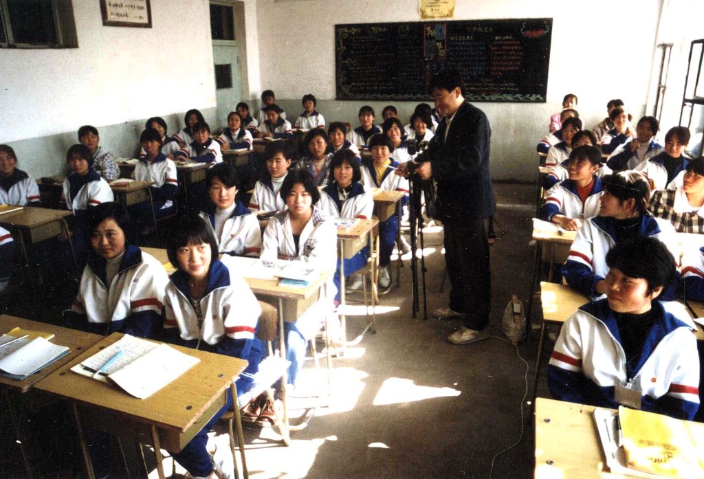 You can begin to understand the Chinese educational system just from viewing a few photos of classrooms. And what you’ll discover is that it differs not all that much from the educational systems of many other countries. The photos at right show a high school I visited in Beijing in 1996, invited by a former student at the normal (i.e. teacher-training) college where I was then teaching. She had by then graduated and become a teacher herself, pictured at the lectern. It’s a typical classroom, holding about fifty students, seated at paired desks arranged six across and eight deep. The seating is generally fixed by the teacher. Some teachers award high-achieving students the choice of their own seats and seating partners; other teachers put taller students in back for better visibility (this female-dominant classroom has only two boys, sitting in the back corners). For comparison’s sake, see the photo below of a Japanese high school I taught at in 1990, also with fifty students. The only telltale difference is the gendered uniforms in Japan (sailor suits for girls, military jackets for boys), versus the unisex tracksuits in China. The classroom layouts are otherwise the same.