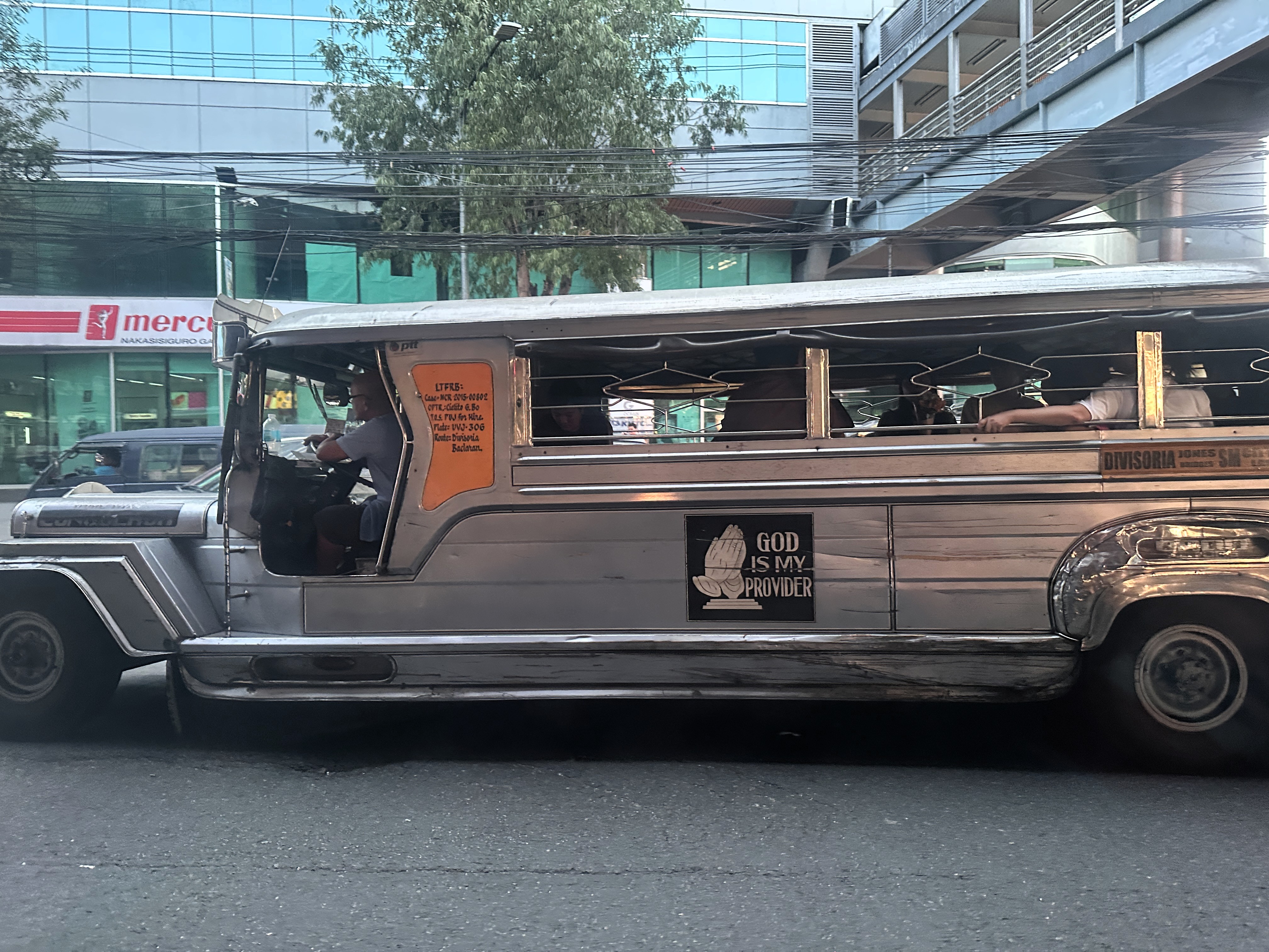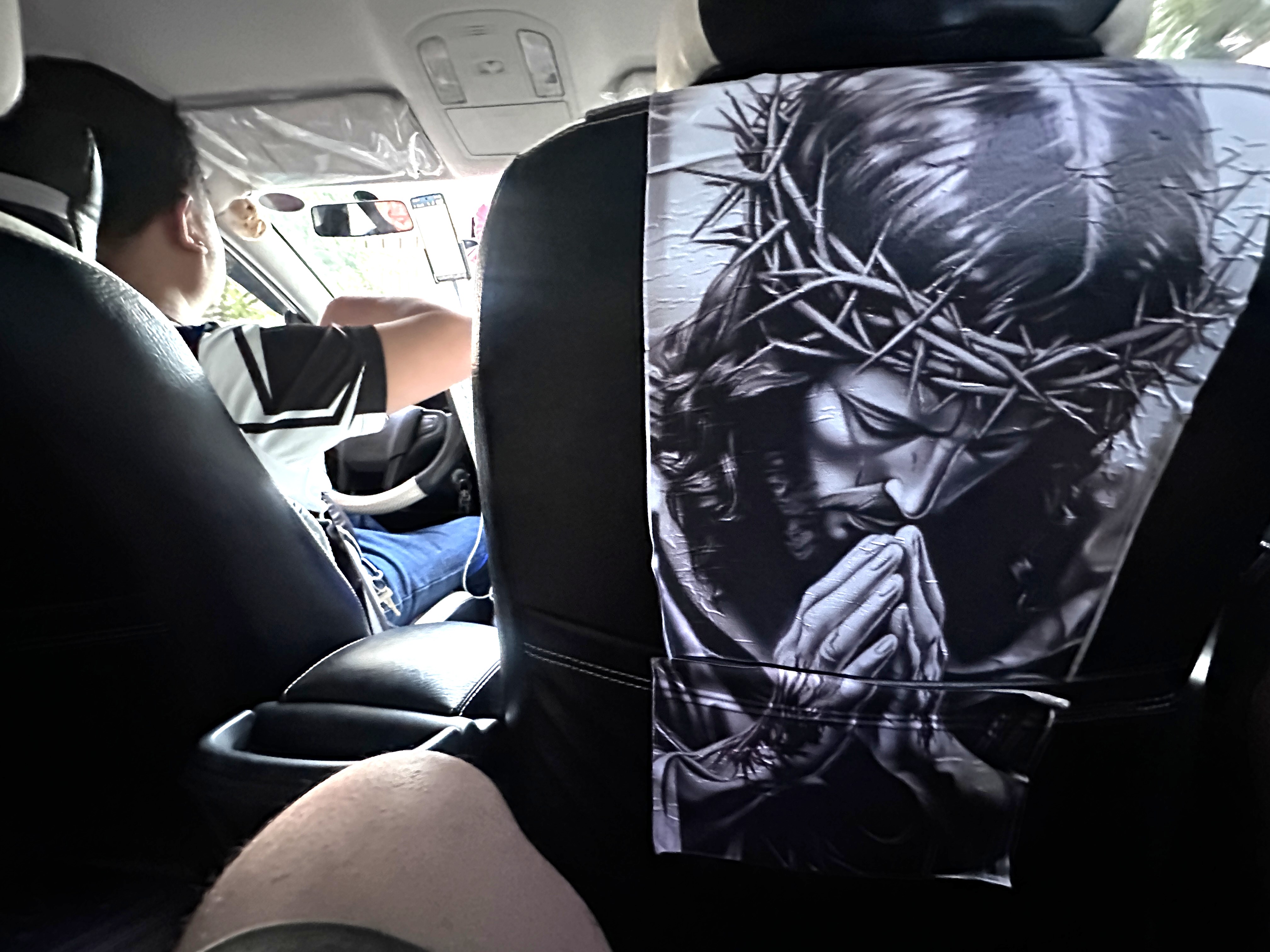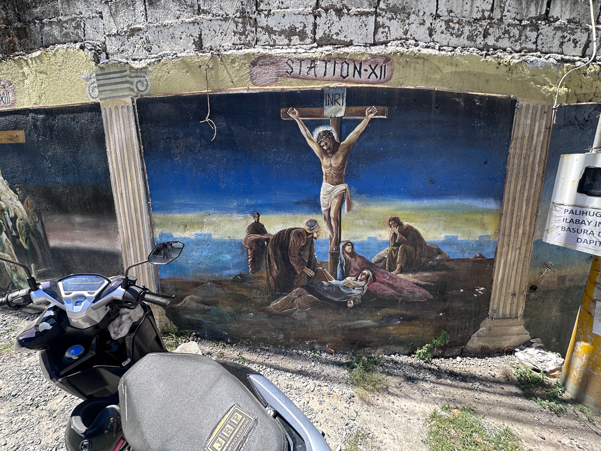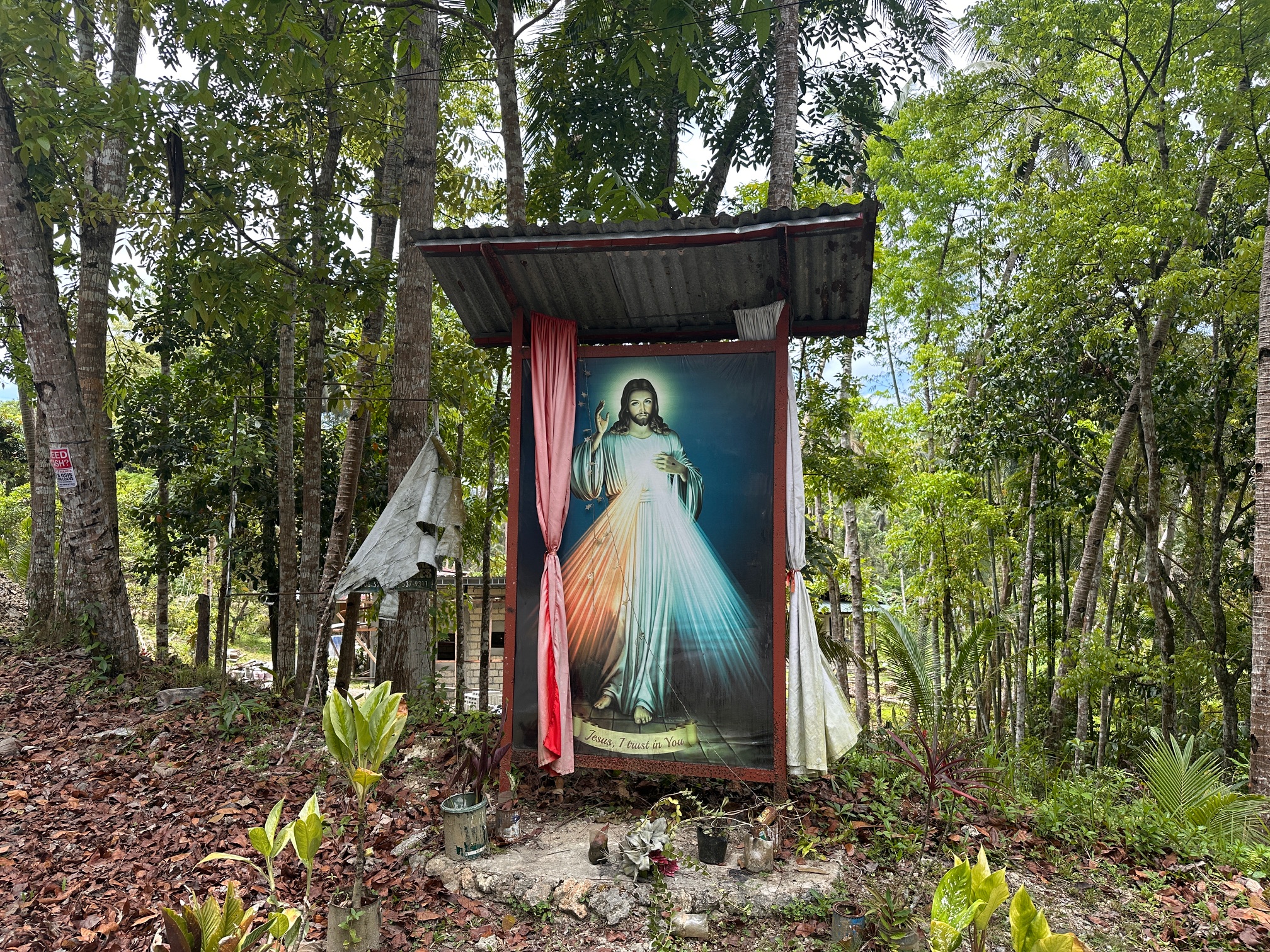 In few countries today are icons and symbols of Catholicism more prevalent than in the Philippines. It is not a theocracy; you are not forced to be Christian. Their presence is like advertising is to capitalism: even when you refuse to buy anything, there is something reassuring about it. The inexhaustible imagery appears wherever people go and in and on the vehicles they go in. Bible sayings lord over traffic intersections from electronic billboards and are printed on public buses and tuk-tuks. Taxi drivers place crucifixes and Jesus quotes in their car interiors. Sidewalk murals depict the twelve stages of the crucifixion. Posters of Christ are placed before turns on country roads to reassure drivers. There are chapels in shopping malls and shrines in ferry waiting halls, and a prayer video in your departing ferry. These are just a few examples of the ubiquity of religious advertising that I encountered on my three-week trip to the country. There are surely countless more in the most unlikely of places. I can’t imagine what the homes of the Christian pious look like, who constitute 90% of the population (Catholics 79%, Protestants 11%).