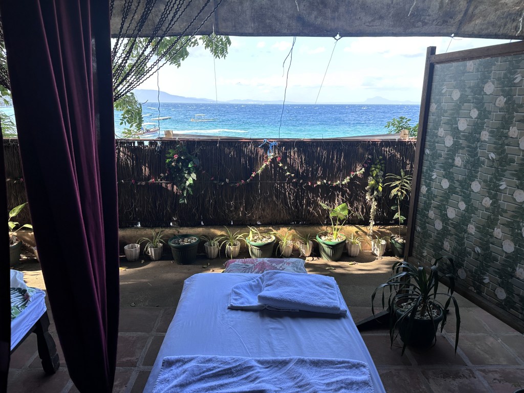 In the afternoon, along the waterfront, next to a raucous expat pub which the evening before had a live band churning out seventies’ hits (“I Shot the Sheriff”), I try the La Palm Spa, with Swedish massage pegged at 800₱, the convenient location, gobbling up drunken pub customers just steps away, justifying the higher than usual price. The pub is closed and all is very quiet, including the spa. It’s a small spa, without a lobby, just a wall one steps around to get inside. I see two massage tables separated by a curtain, and a bed on a raised platform at the far end hidden by another curtain, with a man on it, seemingly asleep. There are no curtains at the front of the massage tables; one looks out onto the sea (photo at top of this post). The priciest New Age spas anywhere could hardly beat this view. But you’ll find yourself, possibly naked, face to face with any customer who walks in—kind of exciting if you’re an exhibitionist, distinctly uncomfortable if you’re not. The problem at present, however, is that there is no masseuse.