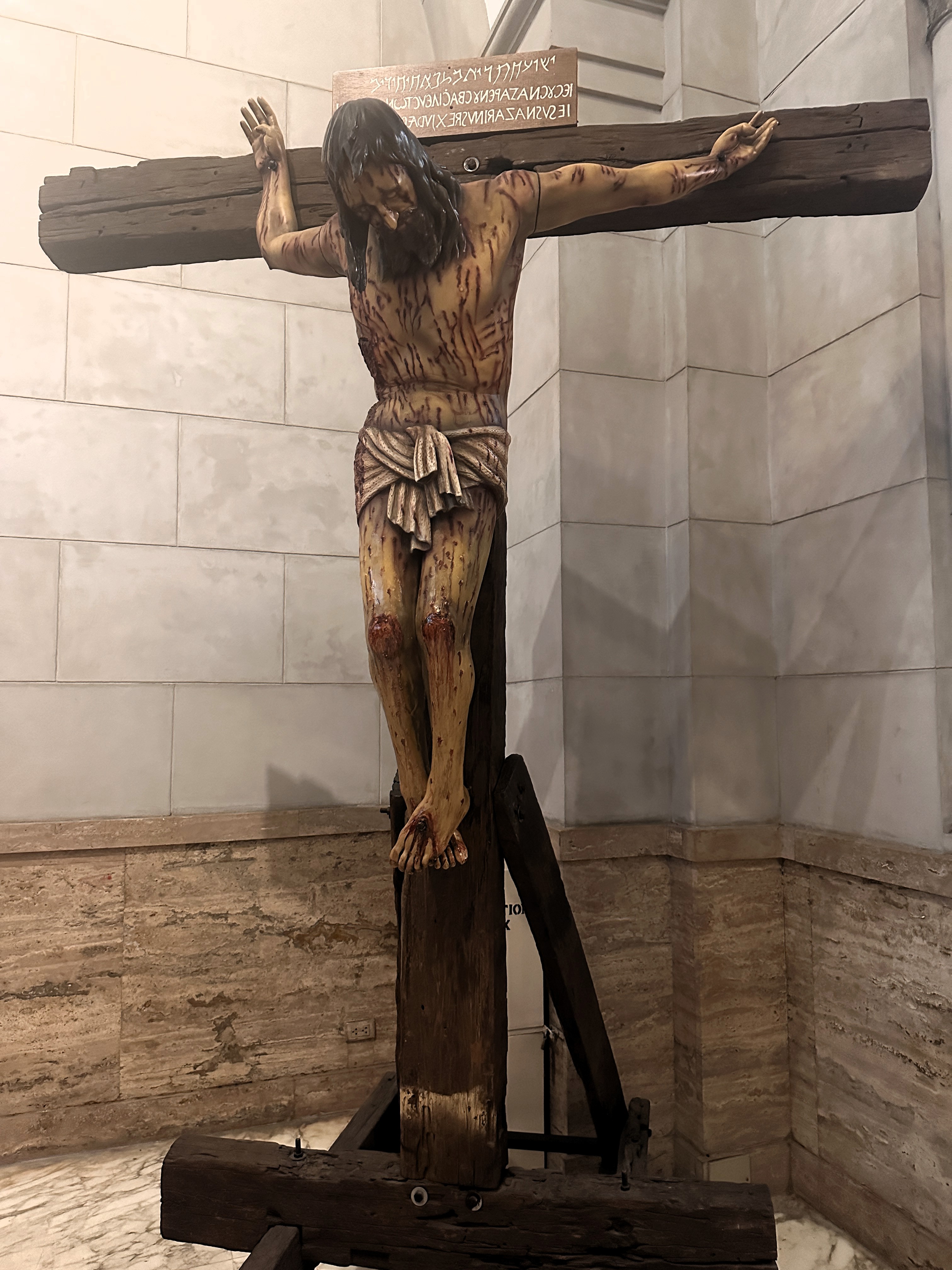 A ferry ride two hours south of Bohol took us to Dumaguete City in Negros Oriental Province. Though it’s a seaside city with a pleasant promenade, there are no beaches and it’s not a tourist magnet. But it does have a lively foreign retiree scene and impressive restaurants and cafés. Try out the Casablanca and Esturya restaurants and the Sans Rival Bistro, Cakes & Pastries—if you’re planning on retiring there. There is also a respectable institution of higher education, Silliman University. And that’s about it. Around the outside of the St. Catherine of Alexandria Cathedral, built in 1776, they’ve wrapped photo montages taken from movies of the twelve stages of the crucifixion. It’s otherwise a rough-looking, grimy city, and the massage establishments reflect that.
